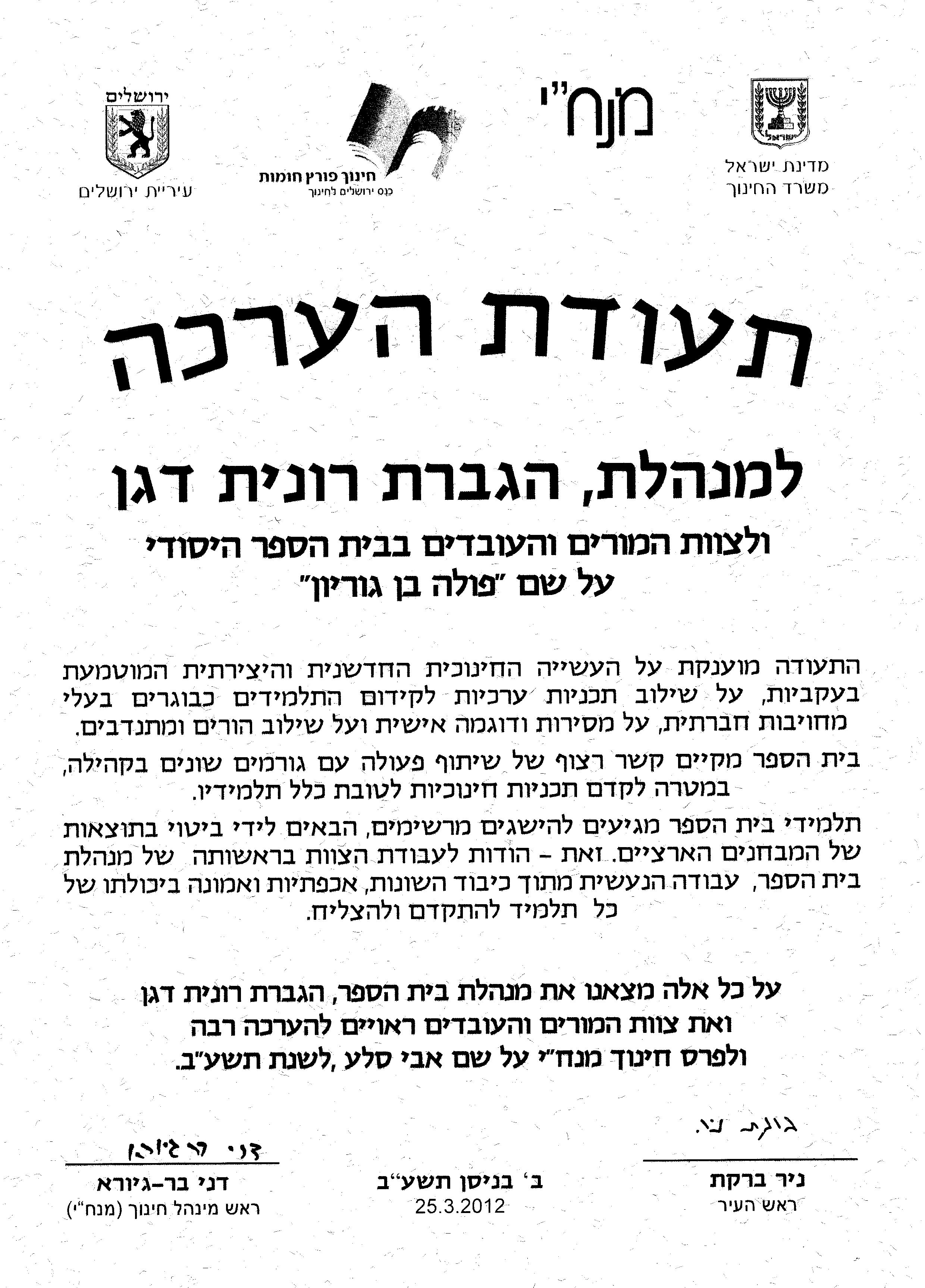 פרס חינוך מנח"י 2012 למנהלת גב' רונית דגן ולצוות המורים והעובדים בבית הספר היסודי ע"ש פולה בן גוריון על: